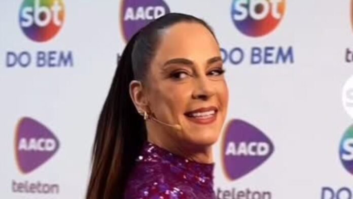 A apresentadora chamou atenção ao surgir com uma produção extravagante no segundo dia do Teleton 2025. O visual ousado dividiu opiniões entre os internautas, que comentaram: “Gente, que roupa é essa?”.
